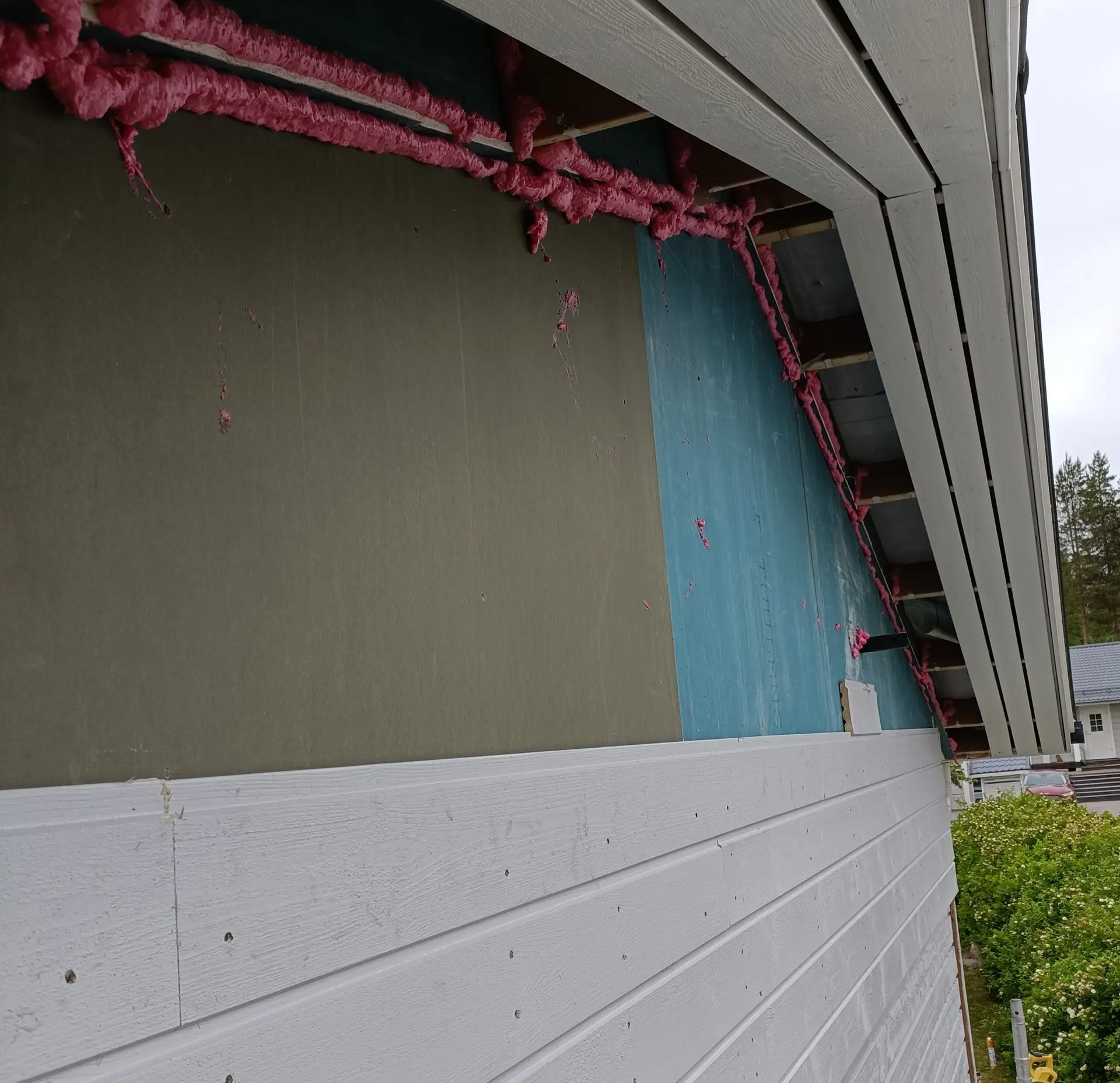 Ensiksi irrotimme osan räystäslaudoista, jotta saimme asennettua kaksi kerrosta palonkestävää kipsilevyä, jotka varmistavat rakenteen palonkeston. Tämän jälkeen paloeristeet sijoitettiin tarkasti tarkoitetuille paikoille. Lopuksi seinä viimeisteltiin alkuperäisen kaltaisella ulkoverhouksella.